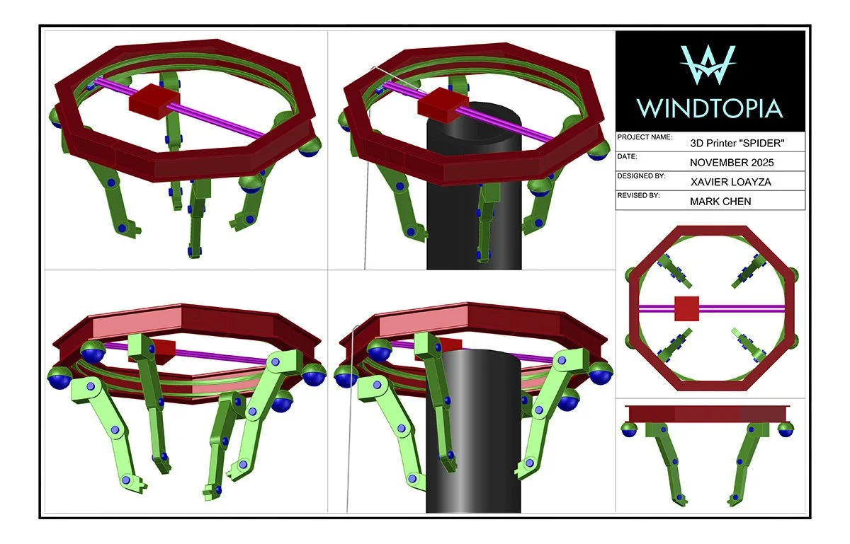 Windtopia’s globally patterned 3D printer “Spider” that manufacture 1000 feet tall turbine towers onsite.